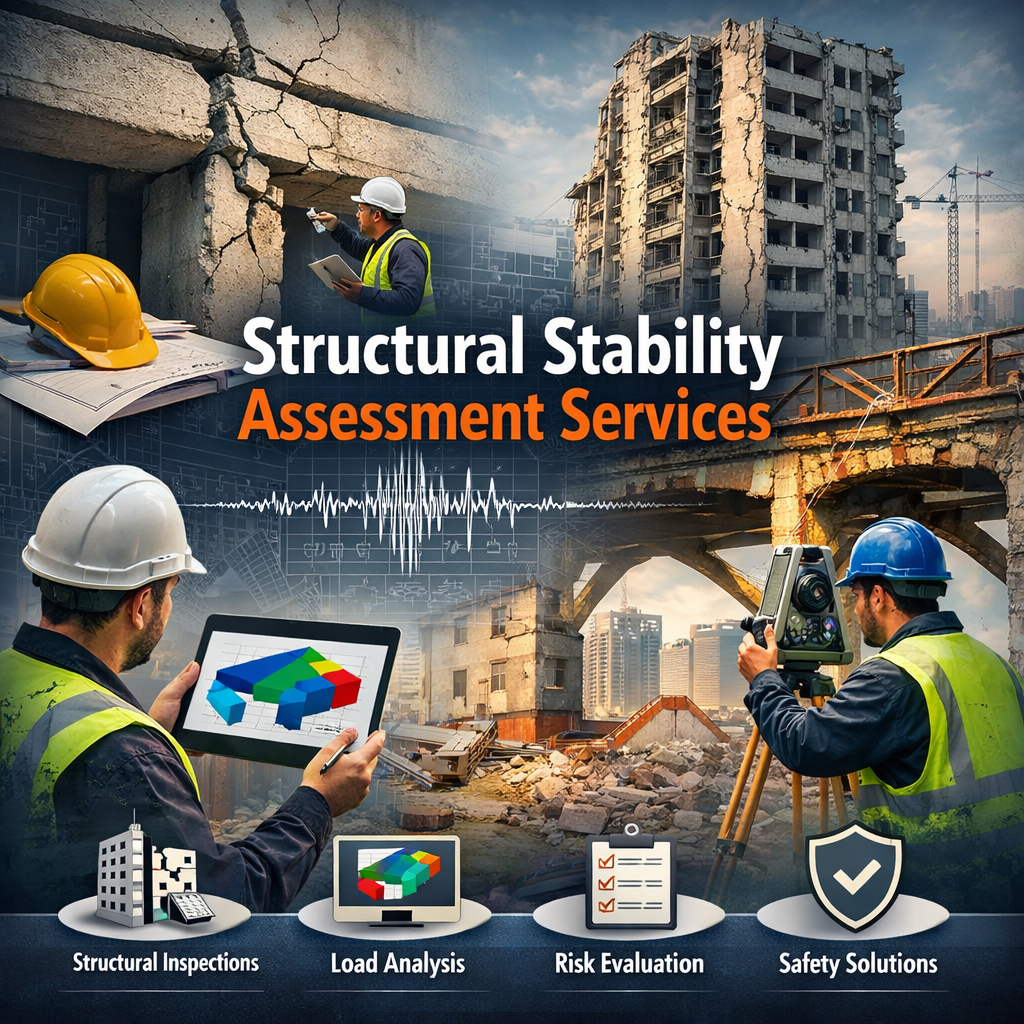 Structural stability assessment includes visual inspection, non-destructive testing, load evaluation, and material performance analysis. Engineers examine cracks, deflections, corrosion, and foundation behavior to determine structural health. The findings assist in planning repairs, retrofitting measures, or reinforcement strategies to restore or enhance safety standards.