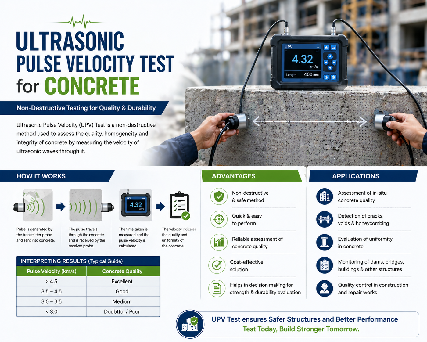 Ultrasonic Pulse Velocity Test for Concrete is one of those techniques that quietly reveals what the surface cannot. Concrete might look solid, but internal cracks or voids can remain hidden unless tested properly.